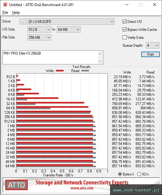 Plik testowy można było odczytać ze średnią prędkością 892 MB/s i zapisany z 438 MB/s.